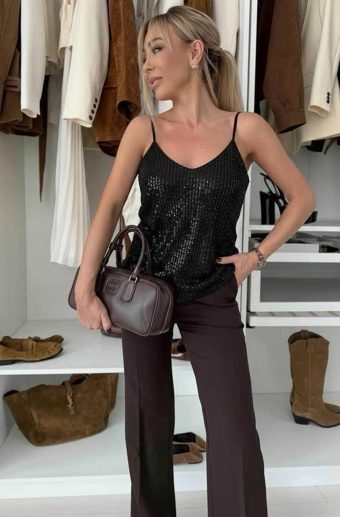 Jasmine Sequin Strap Cami Top-Black