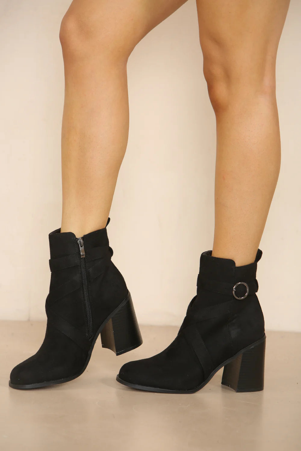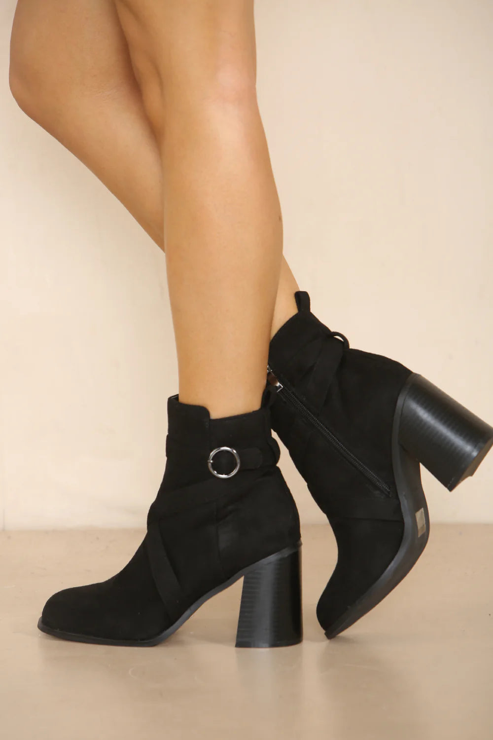 BLACK SUEDE CLASSIC HEELED ANKLE BOOT WITH BUCKLE