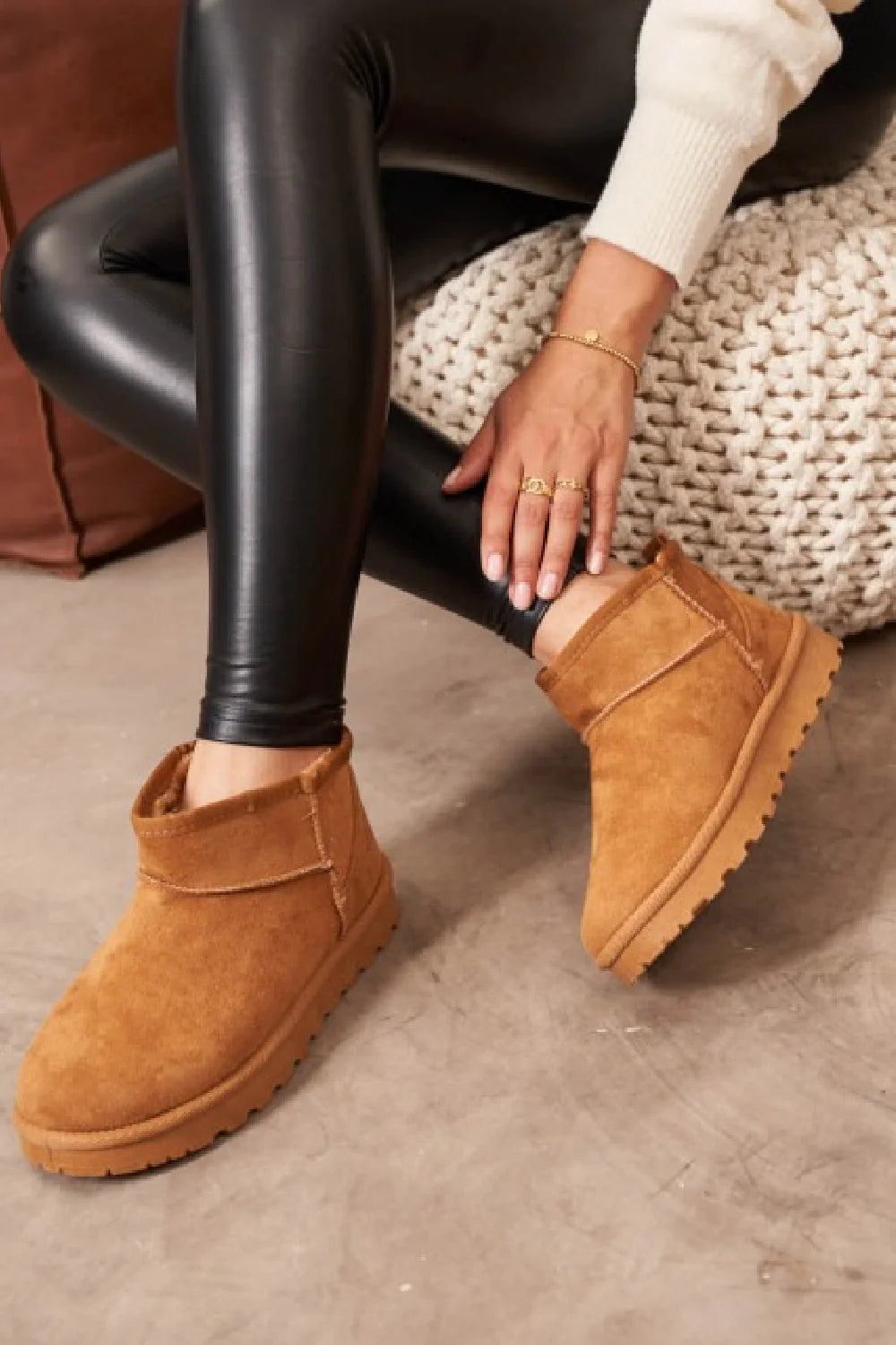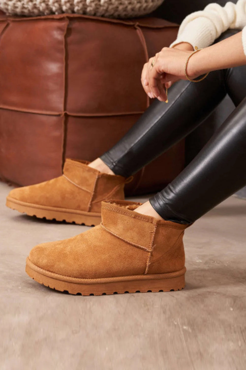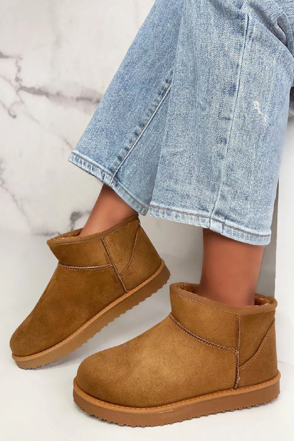 CHESTNUT FAUX SUEDE ULTRA MINI COZY SNOW ANKLE BOOTS
