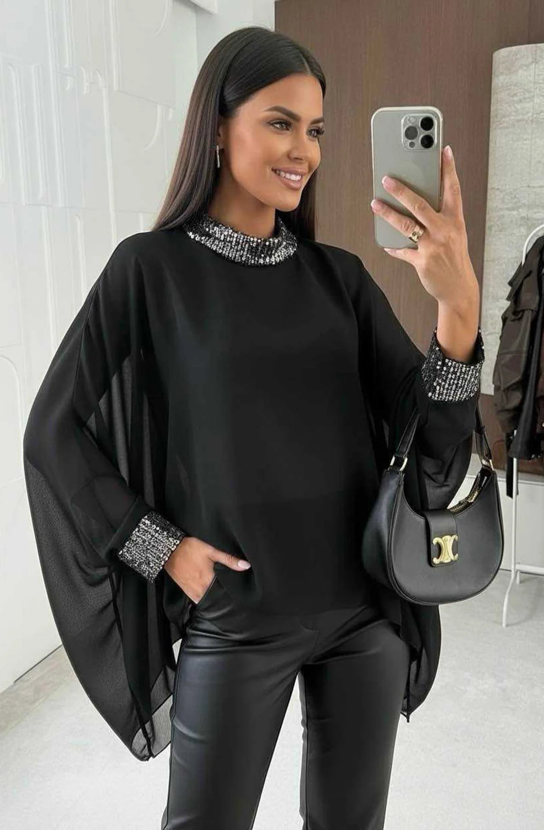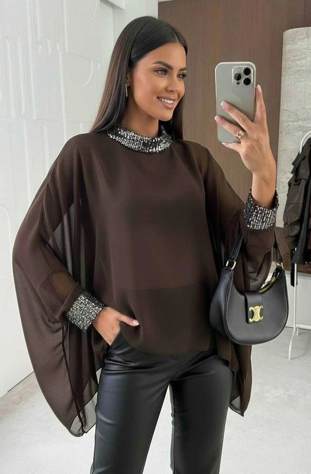 Nela Sequin Trim Batwing Blouse Top-Brown