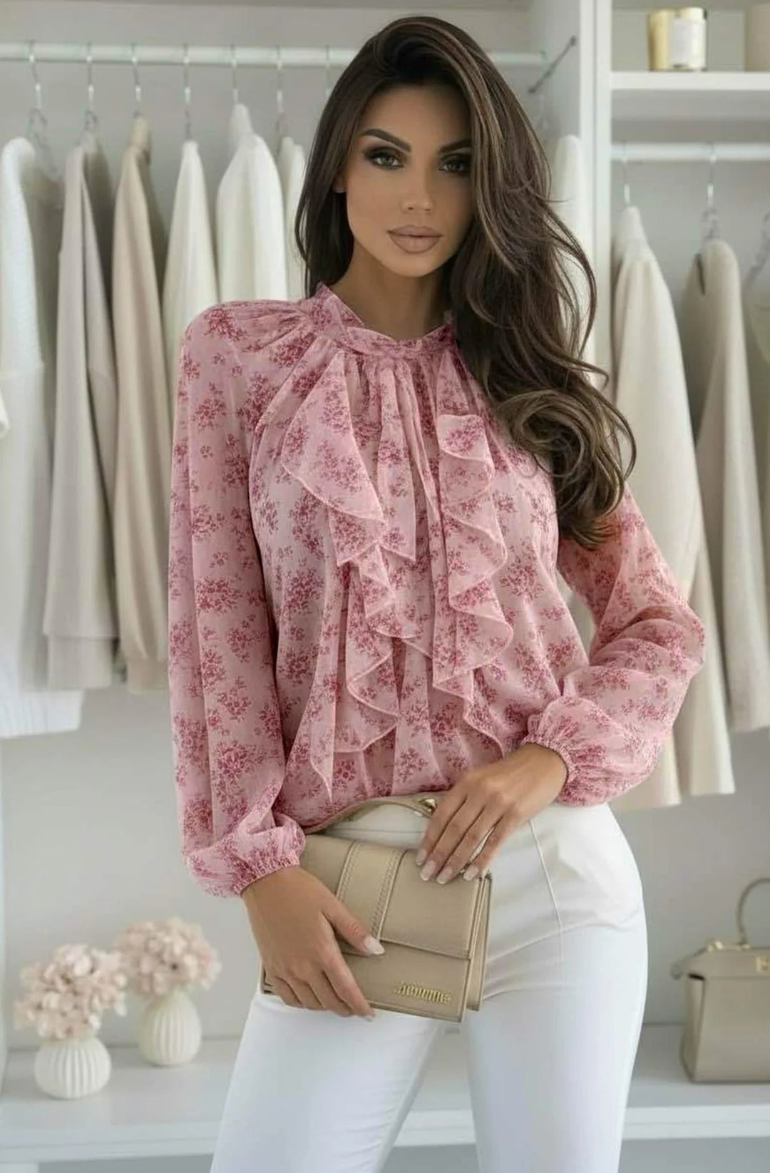 Milani Floral Sheer Ruffle High Neck Chiffon Blouse Top-Pink