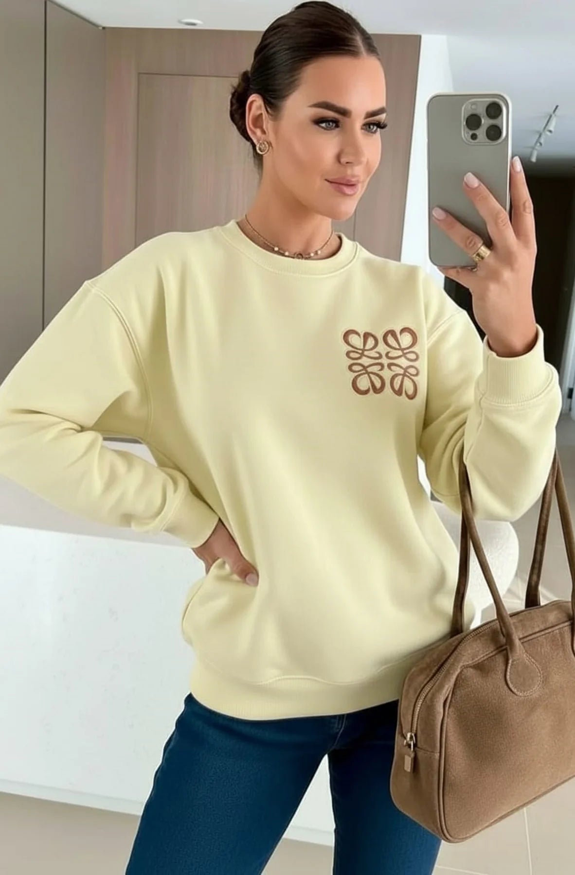 Crafted from a beautifully soft and stretchy fabric, Maris features a decorative front embellishment with subtle shiny inserts ✨ — light-catching glossy details that add dimension and interest (not crystals), giving the sweatshirt a modern, premium finish without overpowering the look.