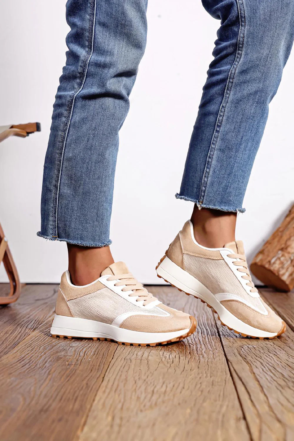 Women's Lace Up Flat Casual Fashion Designer Trainers in Beige